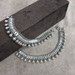 Celebrate timeless craftsmanship with this Antique Silver Payal, featuring intricate rawa ball detailing and a graceful fish motif.